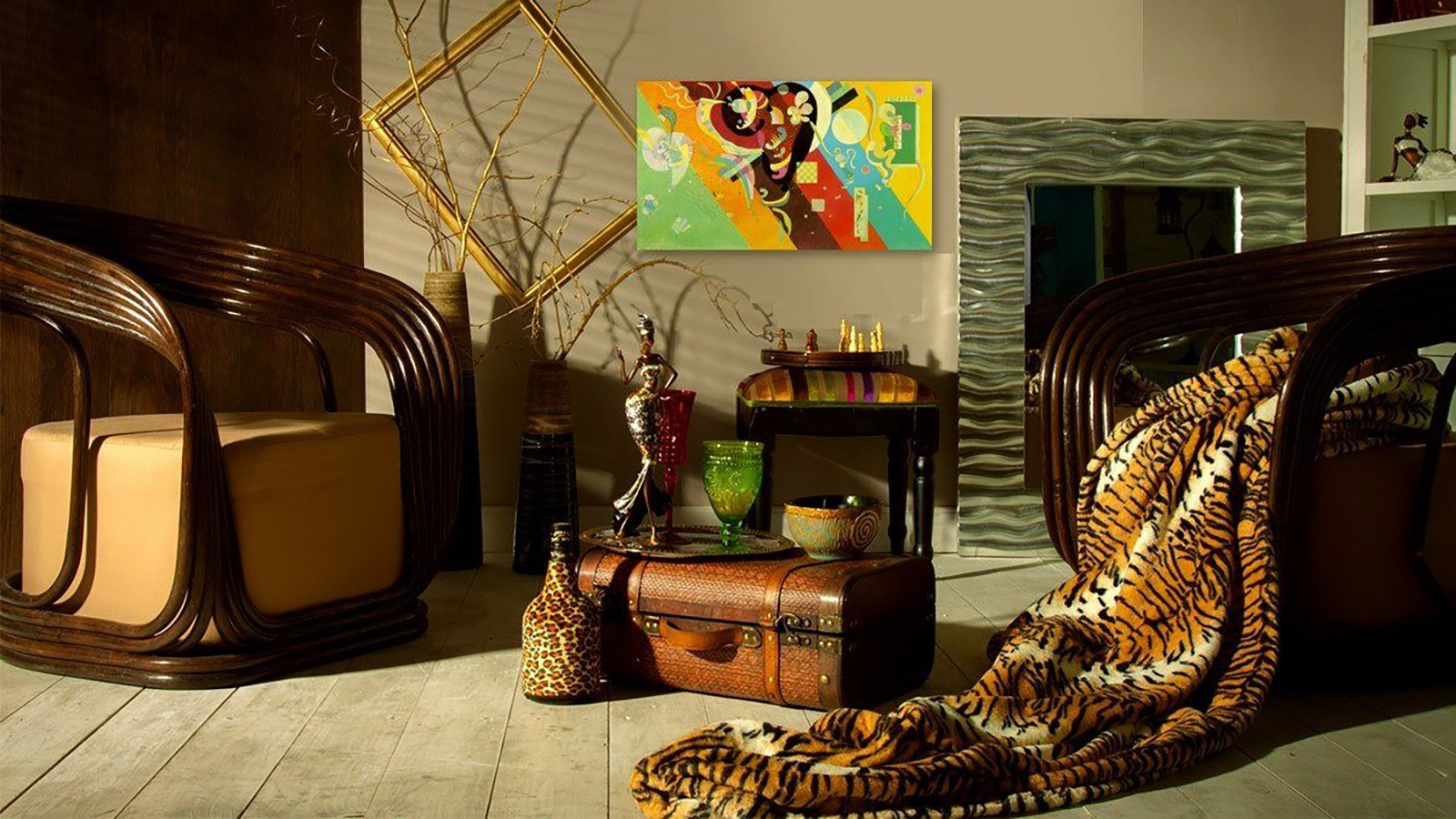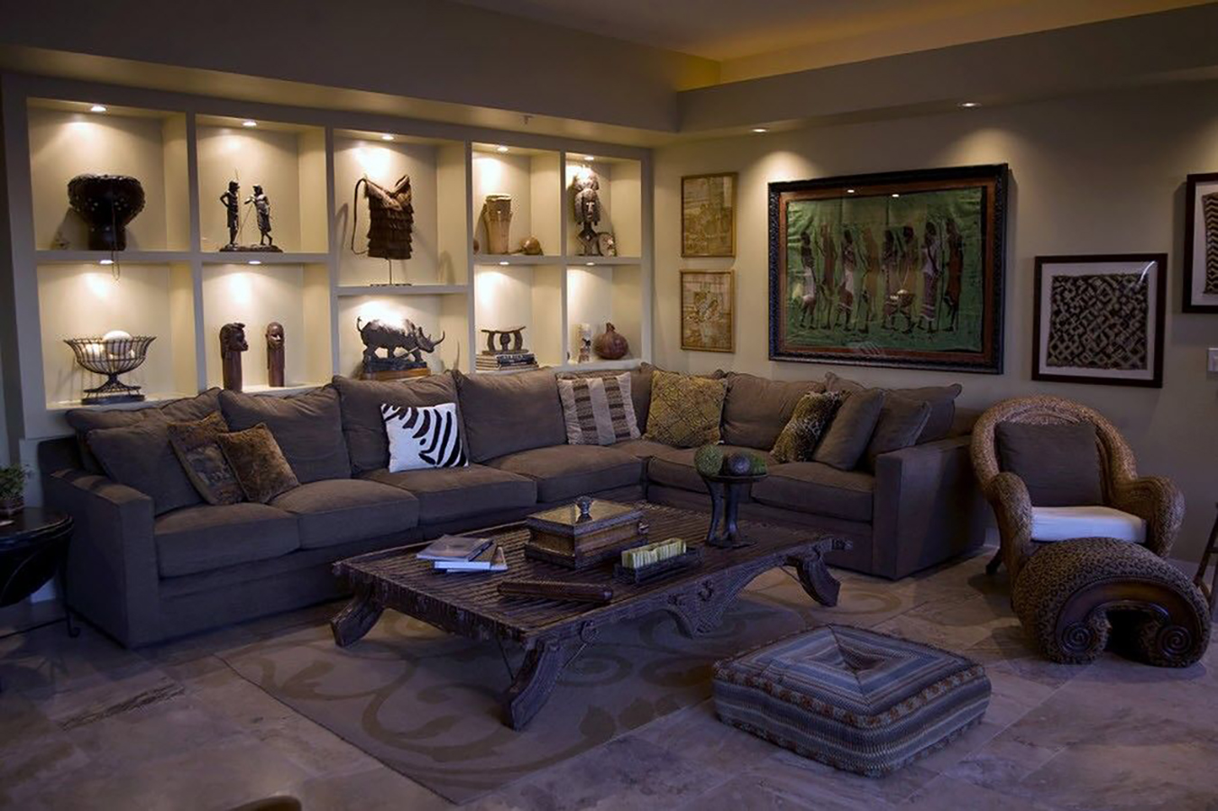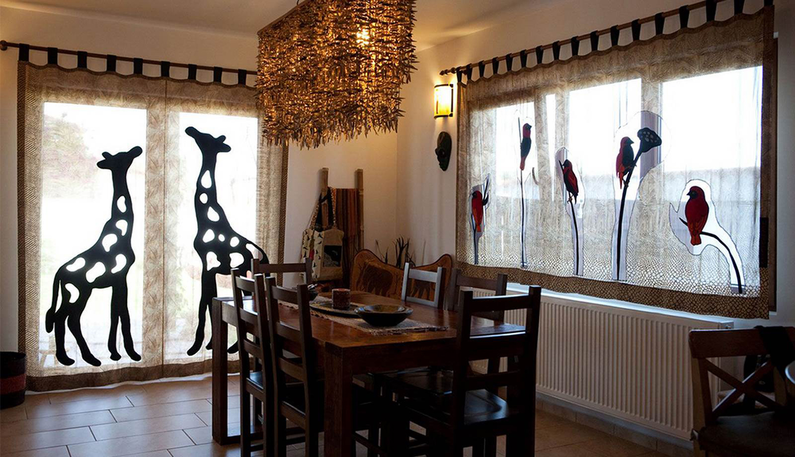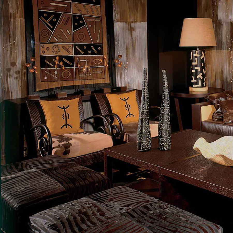 Особо подчеркнуть стиль могут такие декоративные аксессуары, как маски, статуэтки, вазы, рога, расписные блюда, яркие ковры ручной работы, циновки, шкуры, картины с африканским сюжетом,