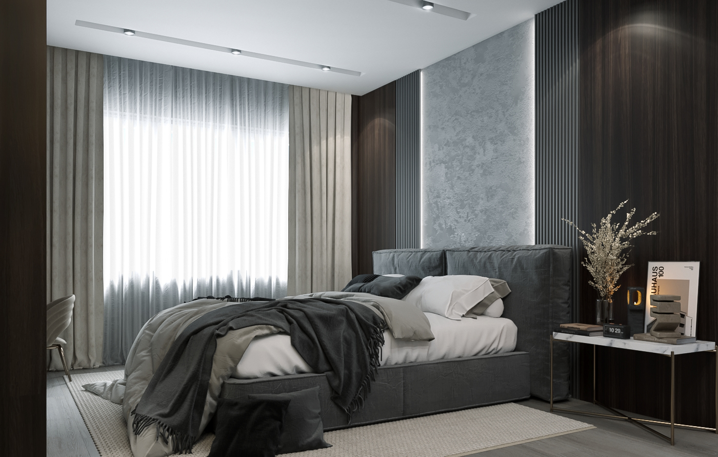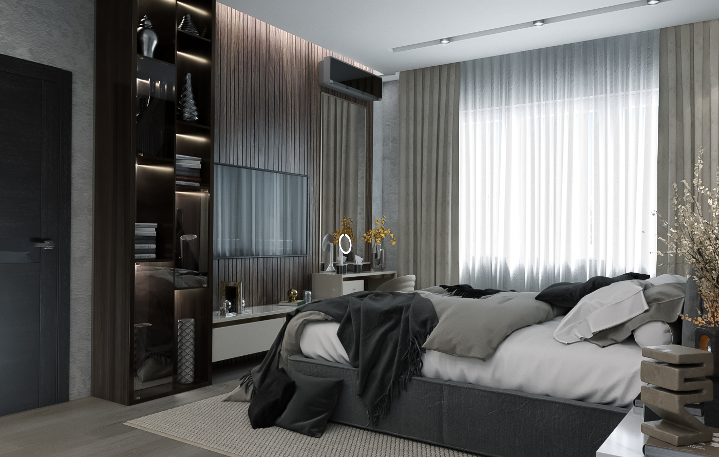 Элегантность и сдержанность – грамотное сочетание темных и светлых оттенков, текстурные панели и мягкое освещение создают эффект роскоши без лишнего пафоса.