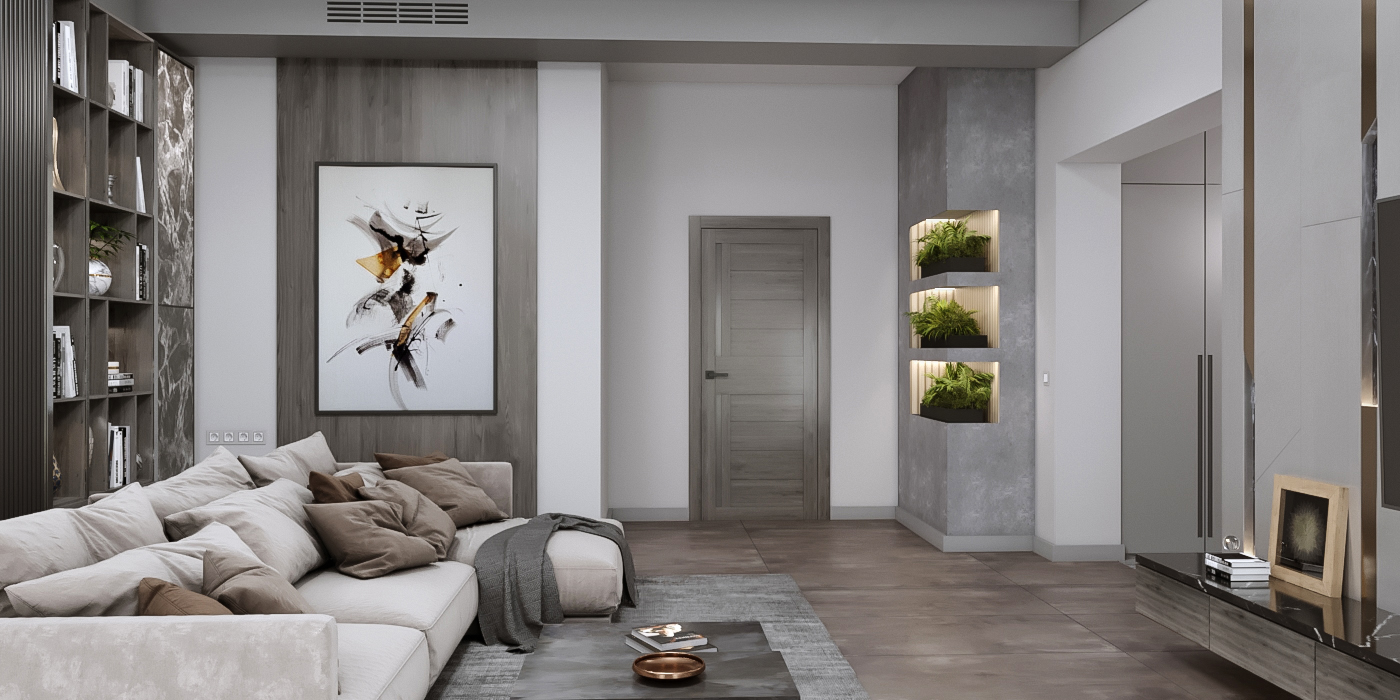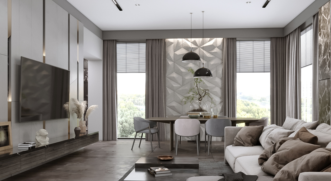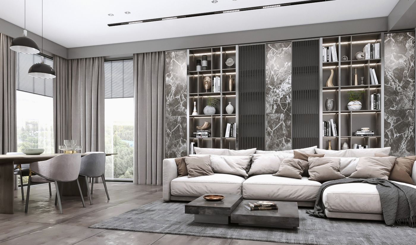Пространство наполнено светом, благодаря большим окнам и лаконичной отделке в светлых тонах: белый, серый, бежевый или приглушенные природные оттенки. В отделке преобладают натуральные материалы, создающие баланс между уютом и современностью. Мебель отличается простыми, но элегантными формами, без вычурного декора, но с продуманной эргономикой. Диваны и кресла – с мягкими, глубокими посадками, а столы и шкафы – с гладкими фасадами и скрытой фурнитурой. Акценты создаются с помощью текстиля, произведений искусства, оригинальных фактур.