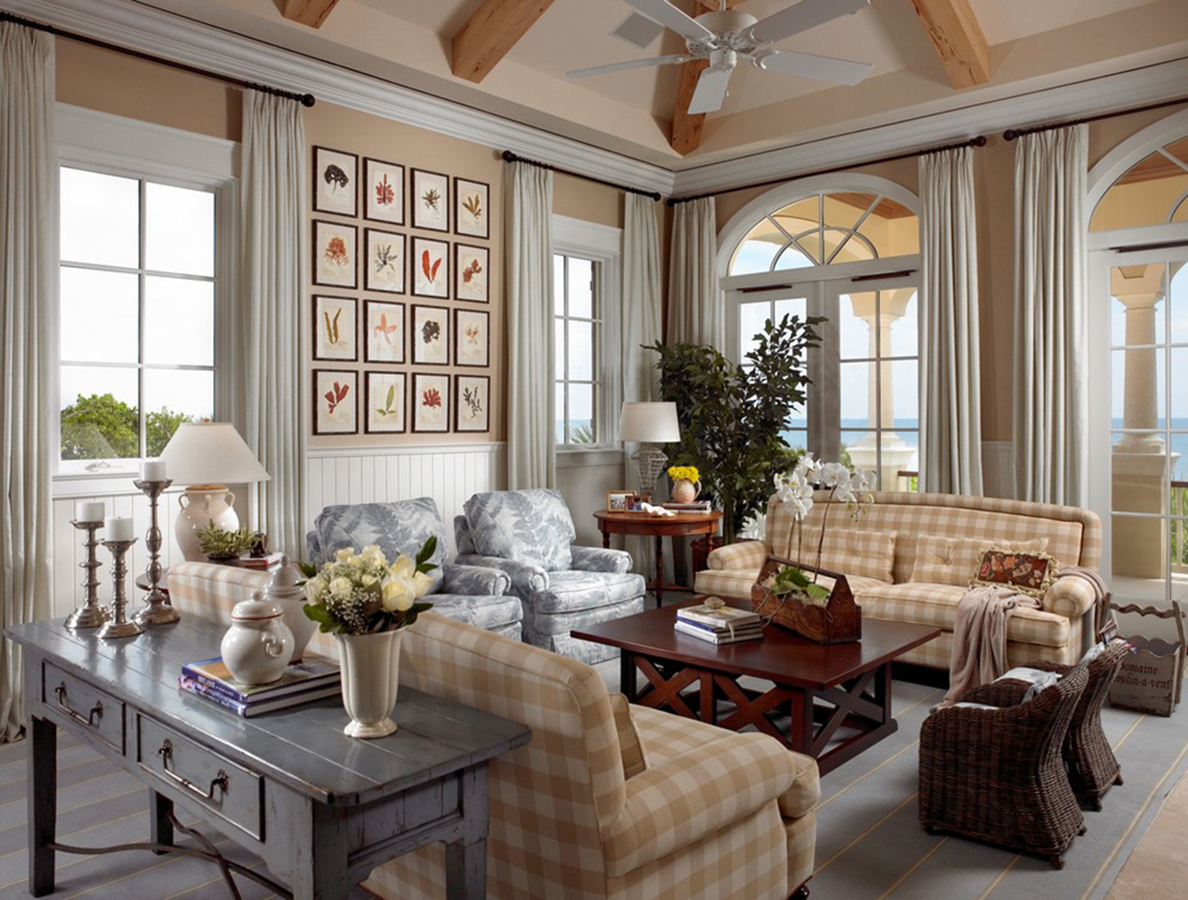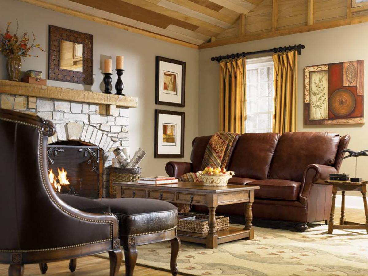 Мебель подбирается прямолинейная, с хорошо просматриваемым древесным рисунком. Встречается ротанговый гарнитур, плетёные предметы. Кожаные элементы в гостиной подбираются в цвет остальной меблировки. Диваны подбираются немного винтажные, будто они достались по наследству. Интерьерные акценты расставляются как раз на меблировку, поэтому она должна быть самым насыщенным элементом интерьерной композиции. Этот эффект достигается цветовым контрастом, то есть светлая мебель размещается на тёмном фоне и наоборот. Главное требование – удобство.