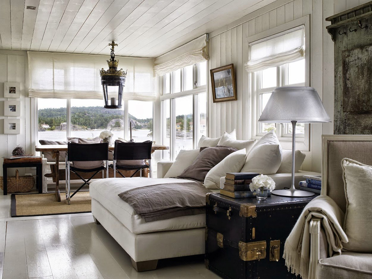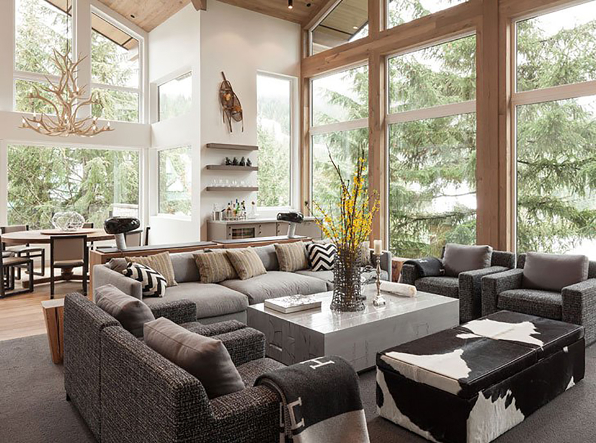 Шале – это стиль альпийских горных деревушек. В шале применяется минимум декоративных элементов и максимум деревянных фактур. Отличительной чертой этого направления является обилие панорамных окон. Мягкие широкие диваны и кресла с высокими спинками имеют немного потертый, выцветший вид. Низкие журнальные столики, деревянные шкафчики с природной текстурой. Подбирается тёплый текстиль с национальной вышивкой: это шерсть, мех, грубая кожа.