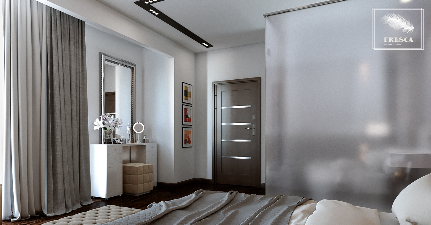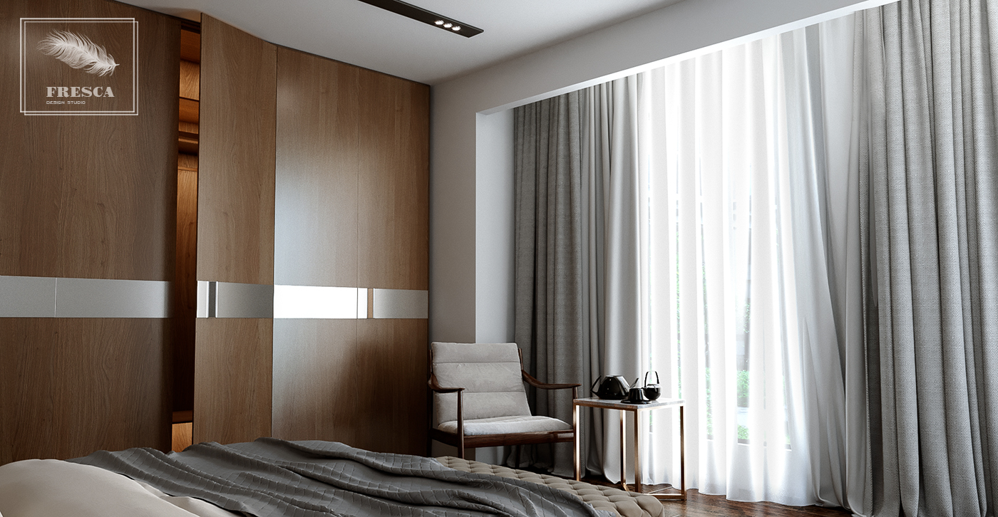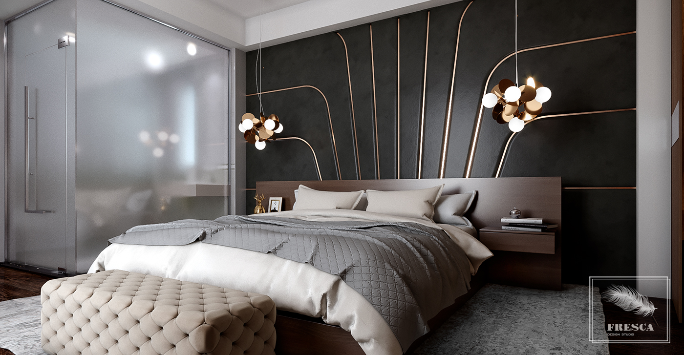 Спальня сочетает современную функциональность контемпорари с изящными акцентами ар-деко,