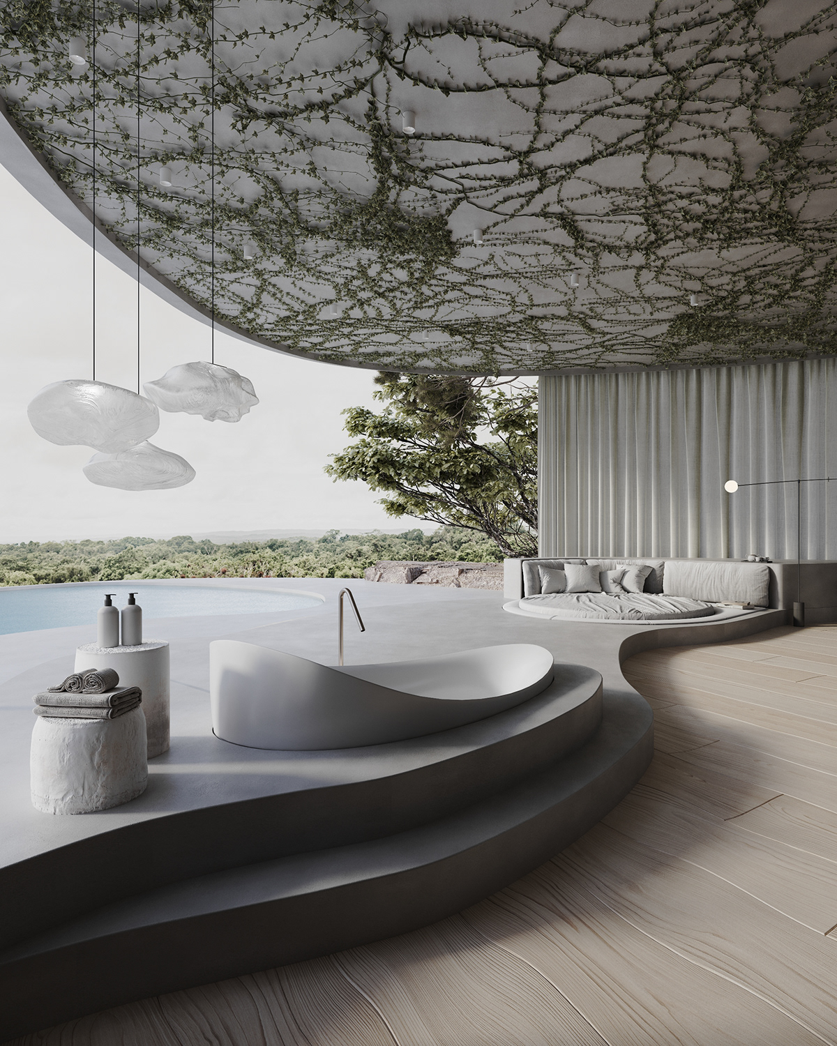 Белые и кремовые ткани, в основном шелк и хлопок, важны в японском интерьере. На постельное белье, покрывала и портьеры наносятся рисунки с растительными мотивами и иероглифы.