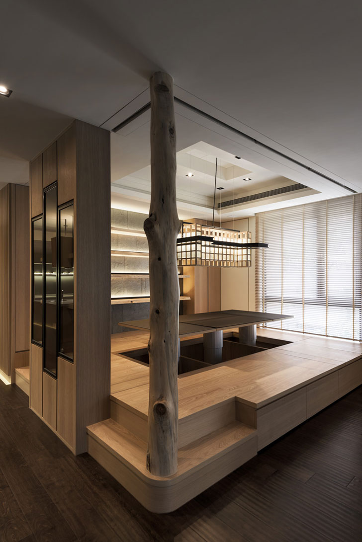 Домашняя утварь и вещи хранятся во встроенных шкафах. Часто используемые ниши в стенах, в которых хранятся статуэтки, блюда с камнями и вазами, предназначены для создания ощущения упорядоченности и природной естественности. Стеклянные столешницы, полки стеллажей и двери шкафов едва заметны. Правильный выбор мебели — обязательное условие для создания гармоничного интерьера в японском стиле. Она должна быть изготовлена из прочных натуральных материалов, таких как дерево, бамбук, тик, тростник. Форма шкафов, тумбочек, столиков и прочего должна быть максимально простой и не громоздкой, а высота небольшой.